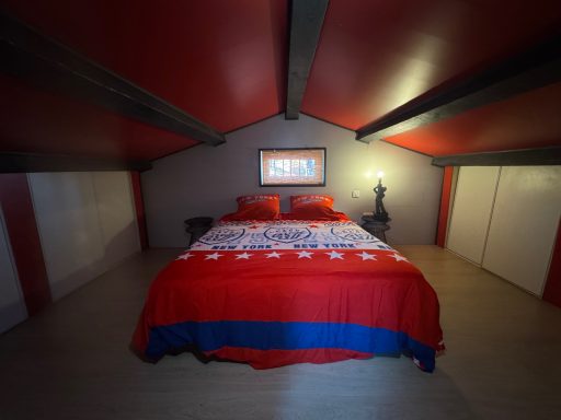 Coin Nuit : Équipé d'un climatiseur mobile, deux chambres en enfilade MANSARDÉES. Une première chambre avec un lit en 160 x 190 et un lit 1 place en 90 x 190 et l'autre avec trois lits en 140 x 190.