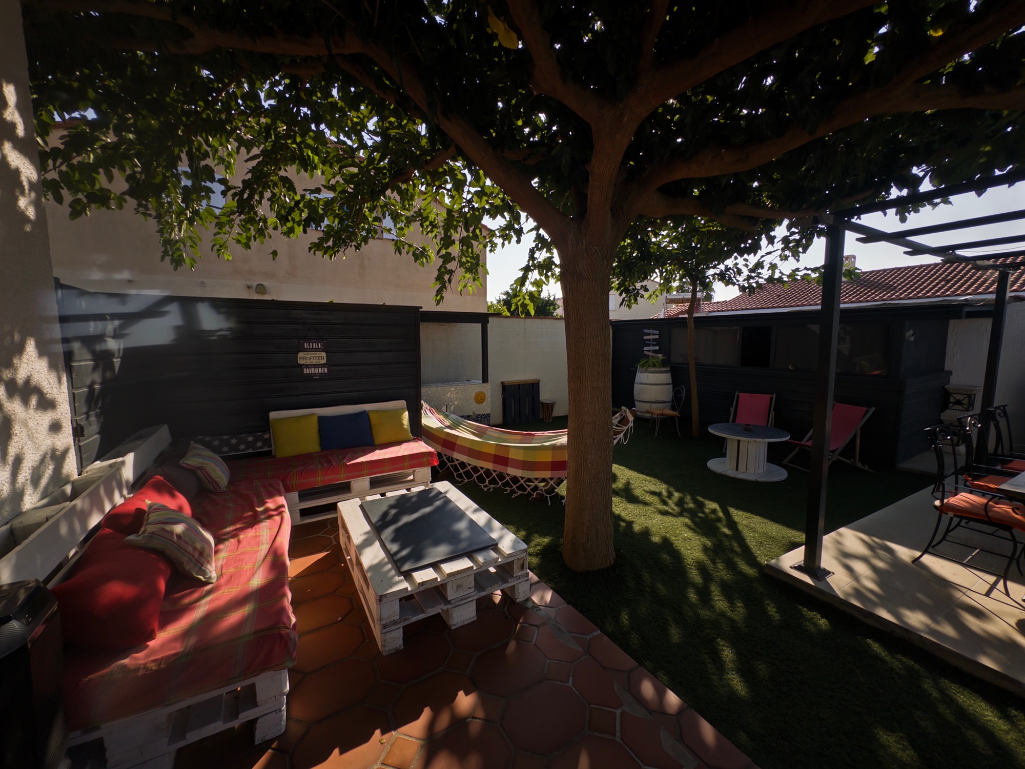 Côté Extérieur sans vis-à-vis : Deux extérieurs non communicants, un extérieur devant la maison avec une terrasse couverte équipée d'un salon de jardin, d'une table ronde 6 places et d'un boulodrome. Un autre extérieur derrière la maison SANS VIS-À-VIS avec une piscine de 8m x 3m et de 1,20m à 1,80m de profondeur, transats, coin canapé d'angle à l'ombre du mûrier et un coin repas avec son barbecue charbon.