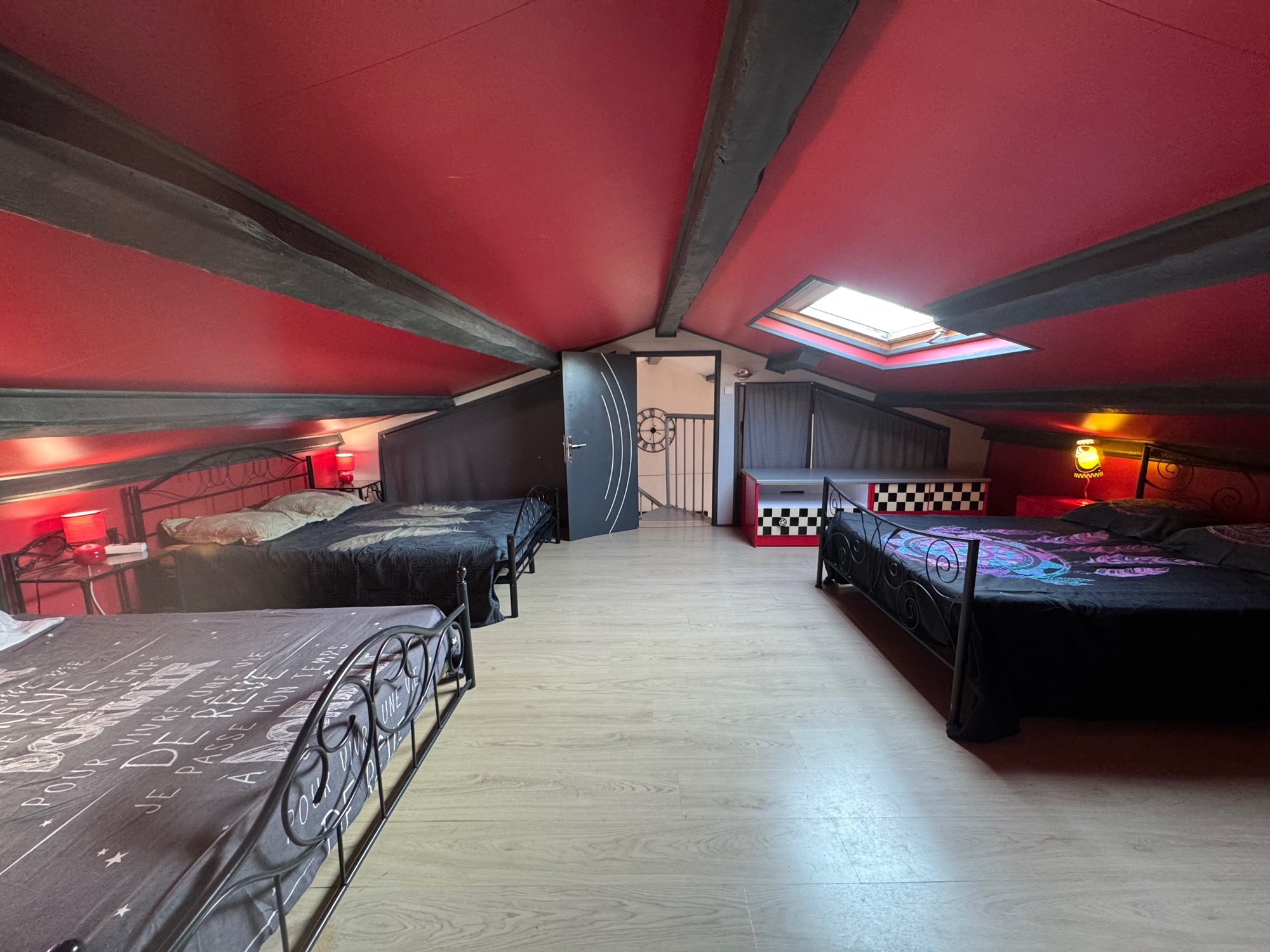 Coin Nuit : Équipé d'un climatiseur mobile, deux chambres en enfilade MANSARDÉES. Une première chambre avec un lit en 160 x 190 et un lit 1 place en 90 x 190 et l'autre avec trois lits en 140 x 190.
