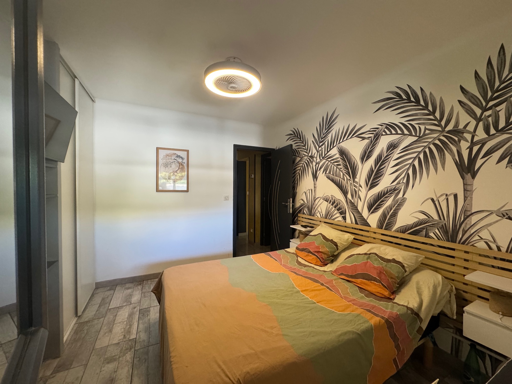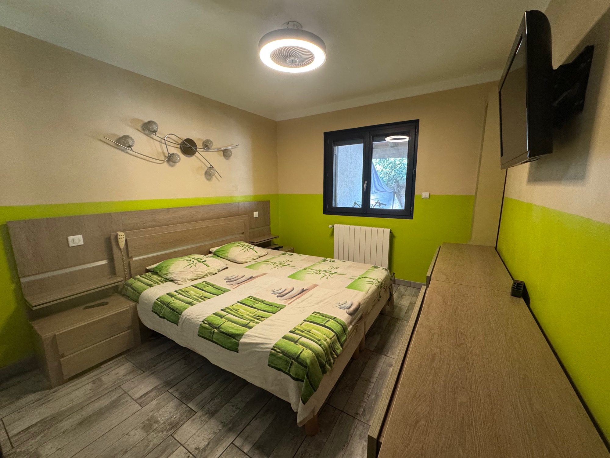 Coin Nuit : Deux chambres dont une avec un lit en 160 x 200, double commode, double penderie et TV et une autre chambre avec un lit en 140 x 190, placards muraux avec étagères et TV.