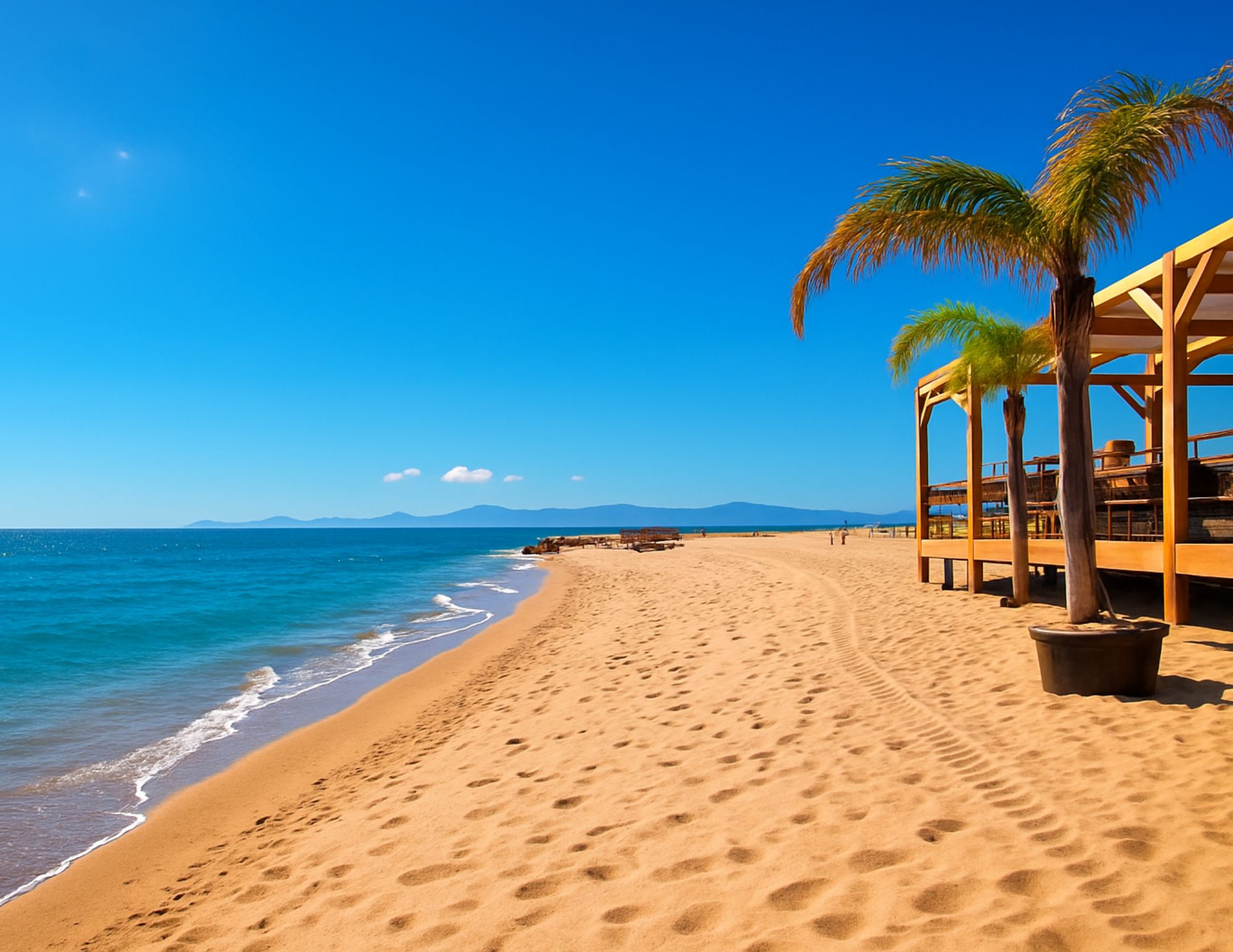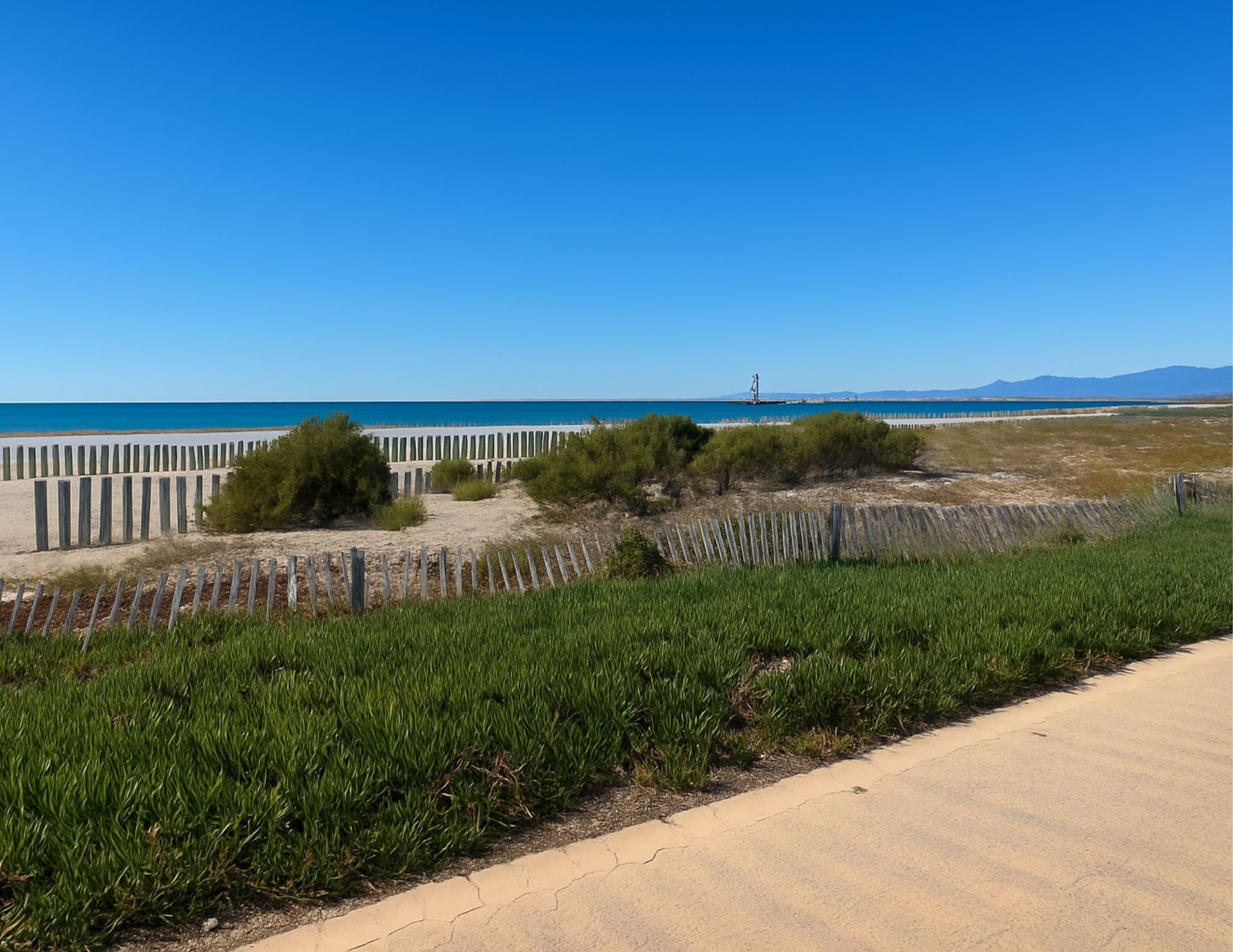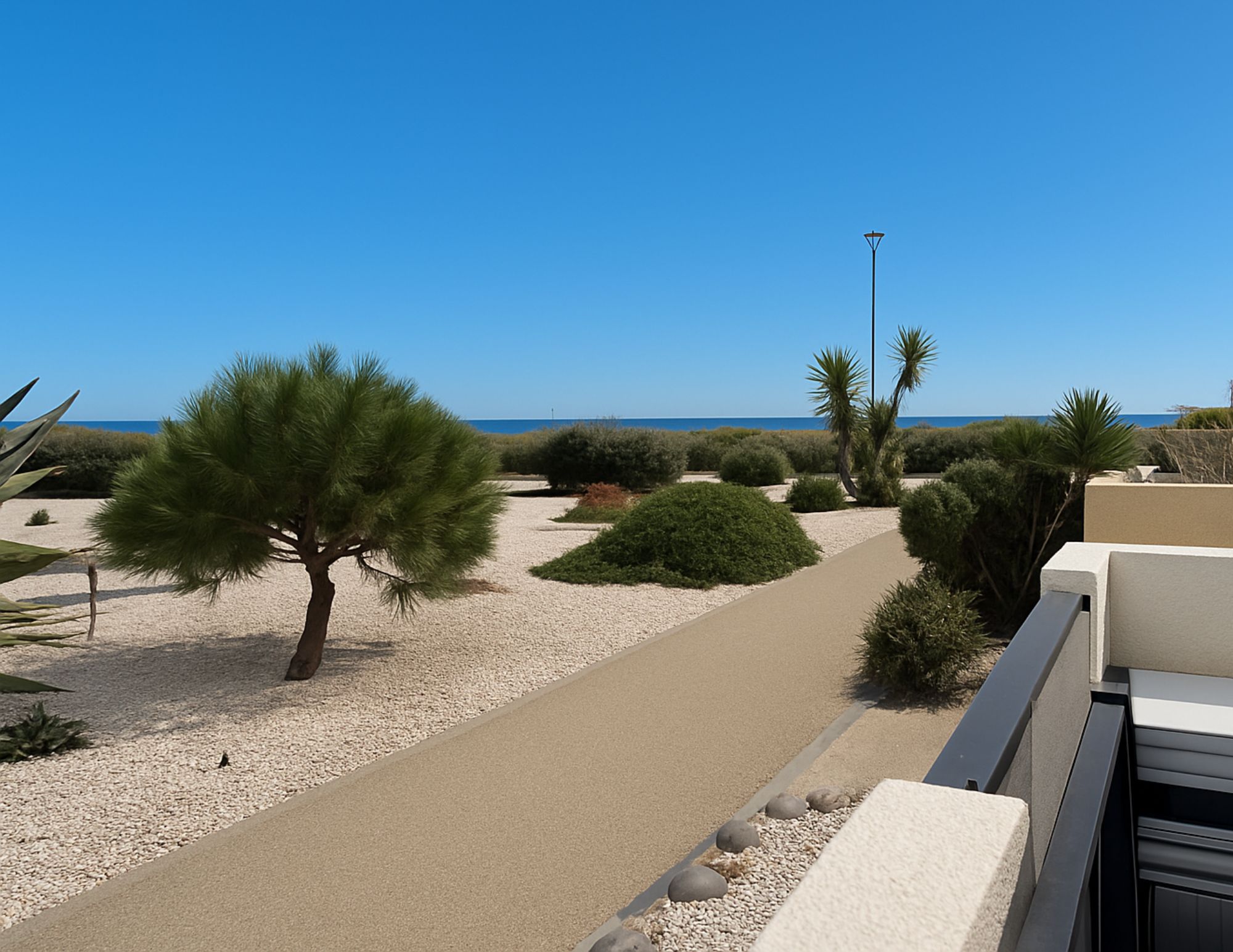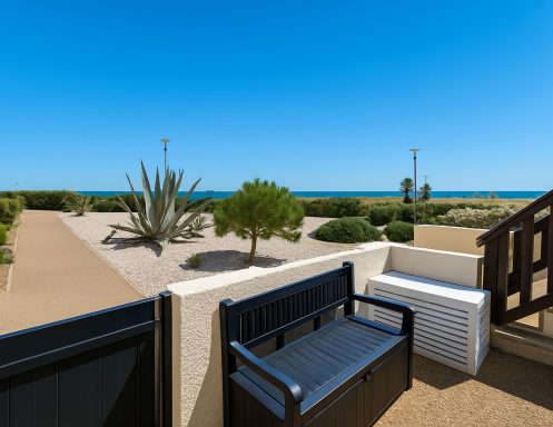 Côté Extérieur : Une petite terrasse vue mer avec un banc pour admirer le mythique Ponton de Leucate et le magnifique couché de soleil sur la grande bleue.