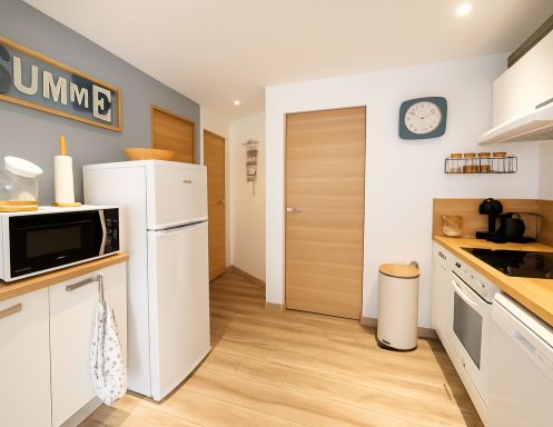 Attenante, une cuisine ouverte équipée d'une plaque vitro, hotte, four, lave-vaisselle, combi frigo congélateur, micro-onde, cafetière, bouilloire et grille-pain. Plancha et Barbecue électriques. Un lave linge est aussi à votre disposition.