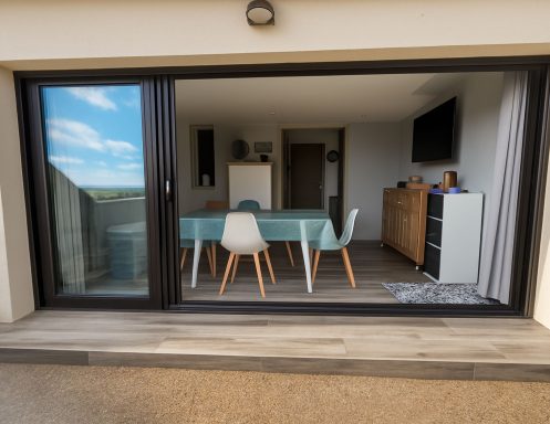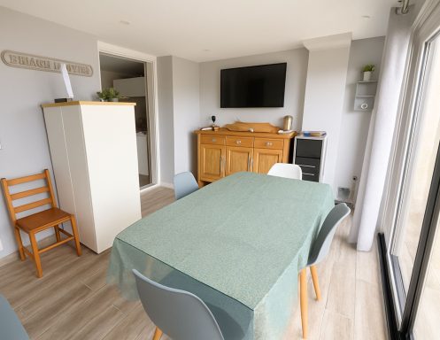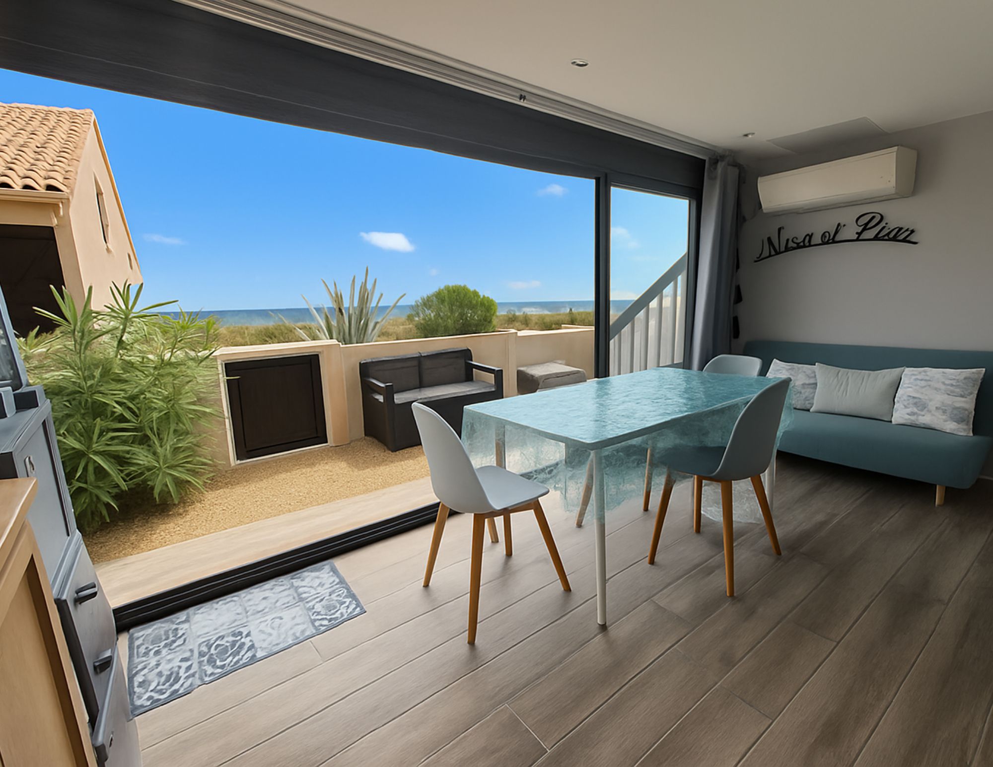Coin Jour : Une pièce à vivre climatisée avec une très grande baie vitrée (ouverture à 3/4) vous permettant d’avoir une vue mer depuis l'intérieur du logement. Un salon avec sa TV 102 cm, WIFI privé mis à votre disposition et un coin repas avec table et chaises.