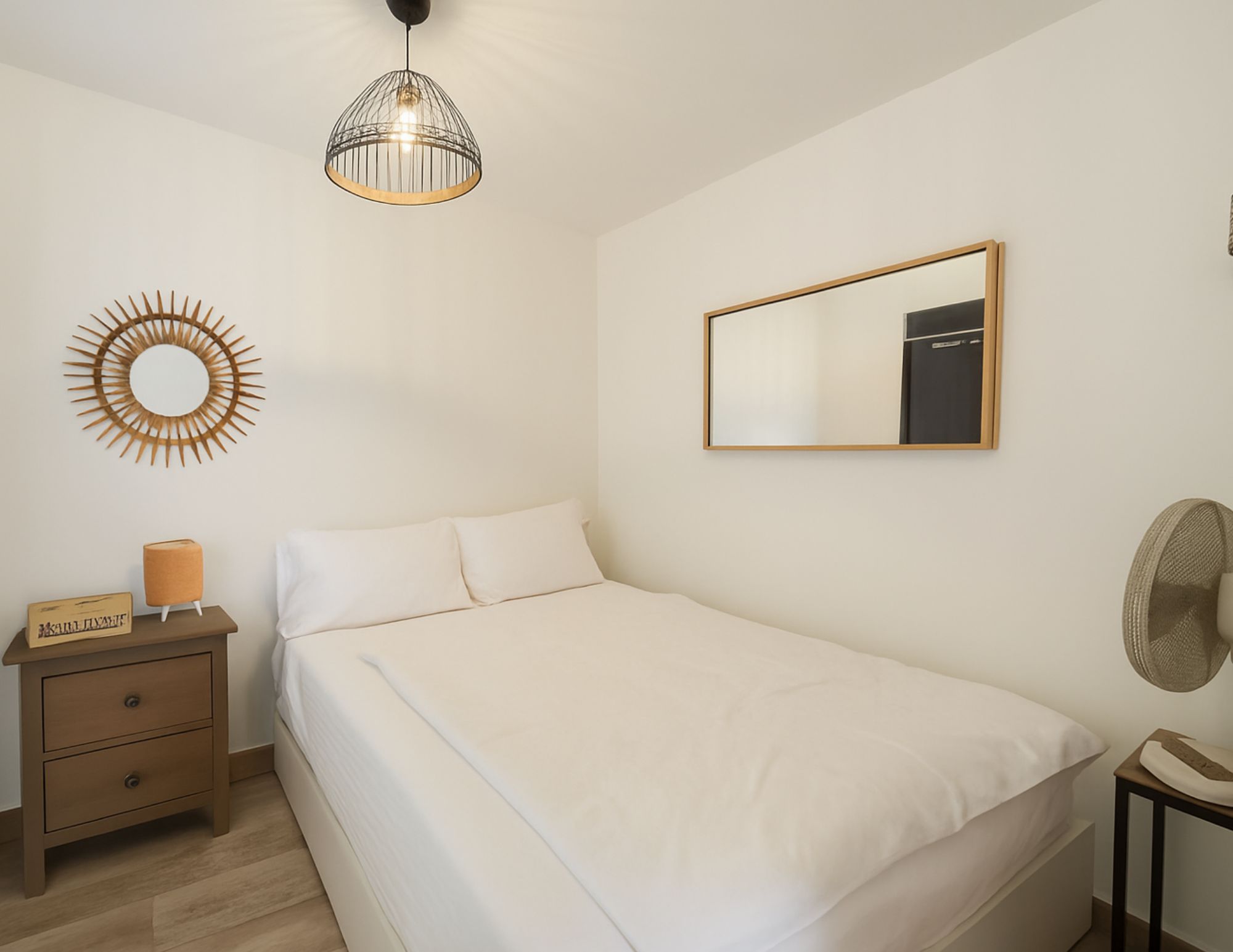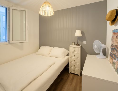 Coin Nuit : Deux chambres, une chambre aveugle avec un lit en 140 x 190, armoire avec lingère et penderie, divers rangements supplémentaires et TV. Une autre chambre avec un lit 2 places 140 x 190 et commode à tiroirs pour le rangement.