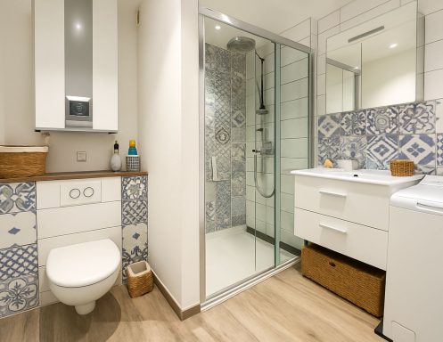 Salle d'eau / WC : Une salle d'eau équipée d'une grande douche à l'italienne 90 x 120, une vasque avec meuble 2 tiroirs, un miroir et un radiateur sèche serviette. Un WC suspendu.